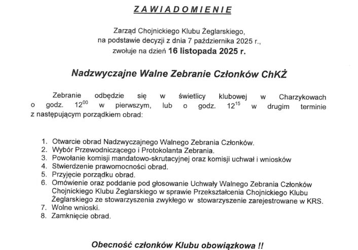 14paź2025 Zawiadomienie o Nadzwyczajnym Walnym Zebraniu Członków ChKŻ Zarząd Chojnickiego Klubu Żeglarskiego, na podstawie decyzji z dnia 7 października 2025 r., zwołuje na dzień 1...