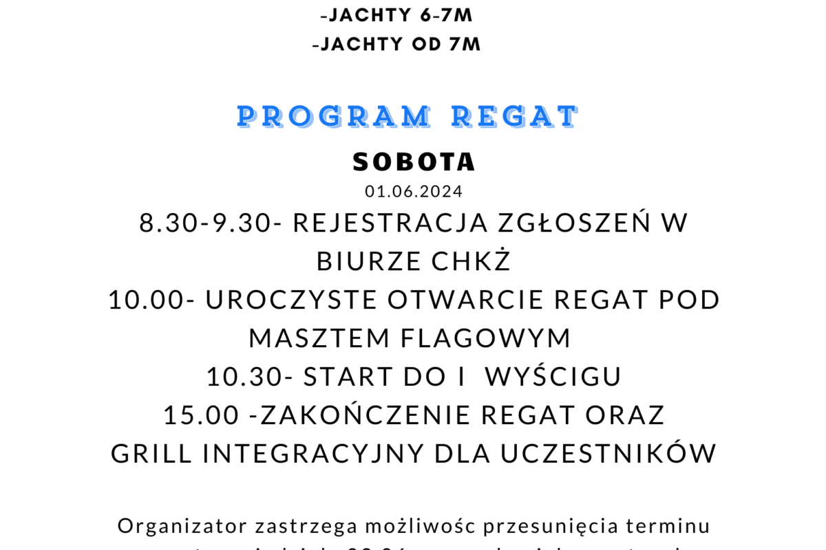 Organizator zastrzega możliwość przesunięcia terminu regat na niedzielę 02.06 z powodu niekorzystnych warunków atmosferycznych.