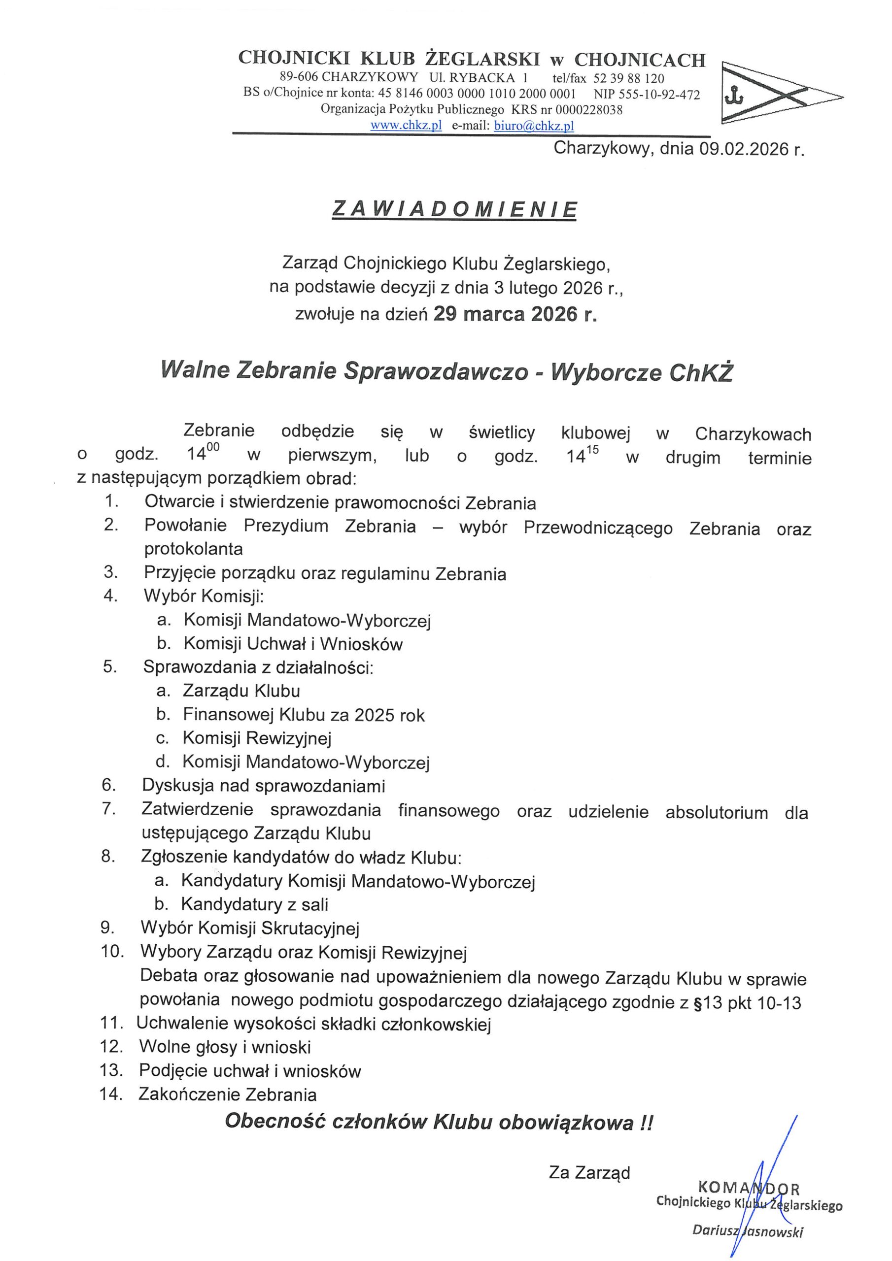 Zebranie odbędzie się w świetlicy klubowej w Charzykowach